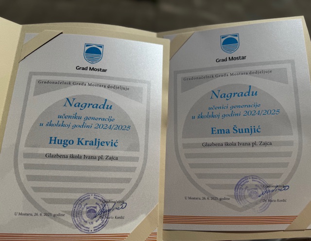 Učenici generacije naše škole u školskoj 2024./2025. godini su Hugo Kraljević, učenik VI. razreda Osnovne glazbene škole (Flauta) i Ema Šunjić, učenica IV. razreda Srednje glazbene škole (Klarinet).